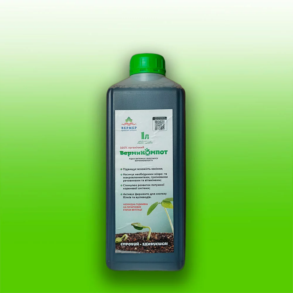 Вермикомпот - это удачное сочетание микро и макроэлементов, в доступной для растений форме, гуминовых веществ и живой полезной микрофлоры. Изготовлен на основе вермикомпоста - продукта переработки червями (Еisеnia fetida) растительной биомассы, для которой мы тщательно подобрали травы и фазу их сбора. Разнообразие трав с их уникальным составом микро и макроэлементов, аминокислот, витаминов и ферментов, полезной микрофлоры вдохновило нас на это название – ВермиКОМПОТ.